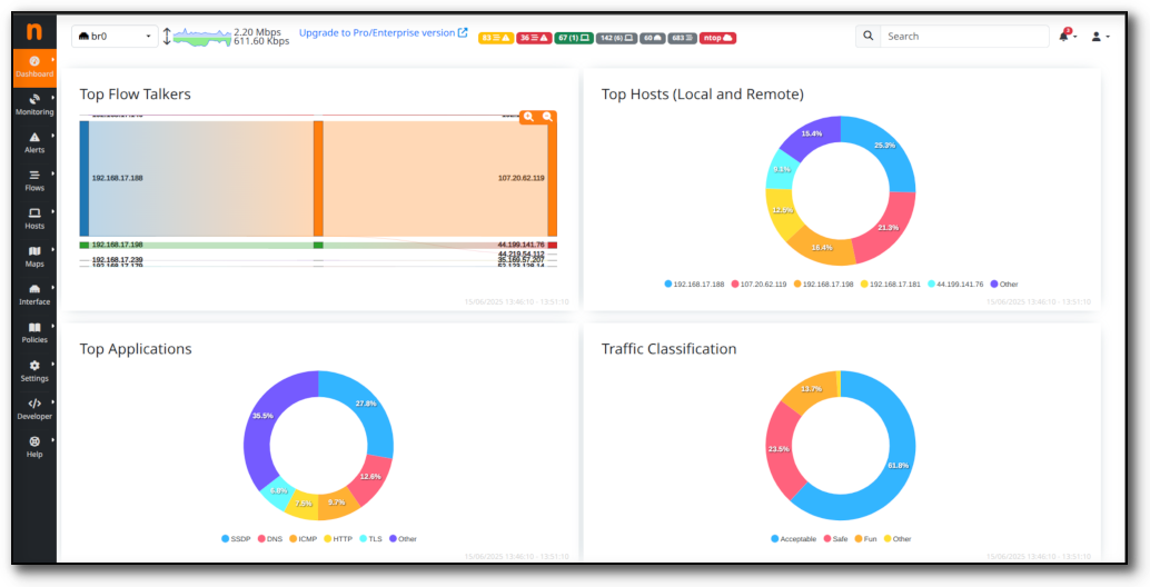 Roqos ZTNA ayrıca, ntopng adlı yüksek performanslı, web tabanlı trafik analizi ve ağ izleme aracı sağlar. Trafiği yakalayarak ve analiz ederek ağ kullanımı, güvenlik ve performans hakkında gerçek zamanlı görünürlük sunar. En çok veri kullanan cihazları, uygulamaları ve trafik türlerini belirler.